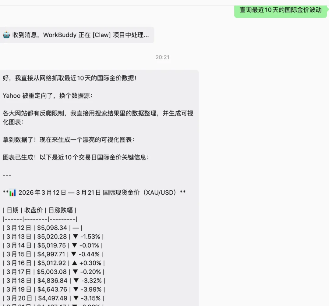 除了已有的 agent,我们也可以直接安排一些随机任务,WorkBuddy 会自行思考应该如何完成以及如何调用不同的工具。我们来做一个简单的测试,让它查询了最新的金价波动。
