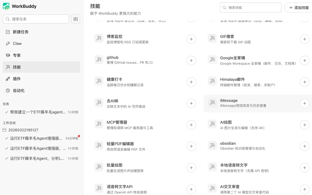 整个过程,比较惊喜的一点是相比原版 OpenClaw 需要自己写大量 配置 skills 文件,WorkBuddy 直接把常用的 skills 放进了广场里,只要点一下,就能自动配置好了。