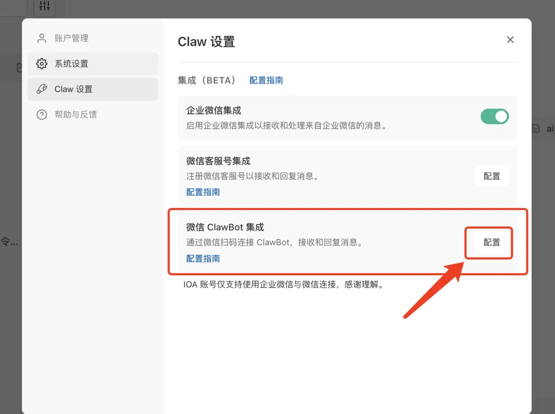 接下来,想接入微信?点一下页面左侧的 Claw 设置按钮,选微信客服号集成,再点一下右侧的配置按钮,用微信扫一下弹出的二维码就大功告成。