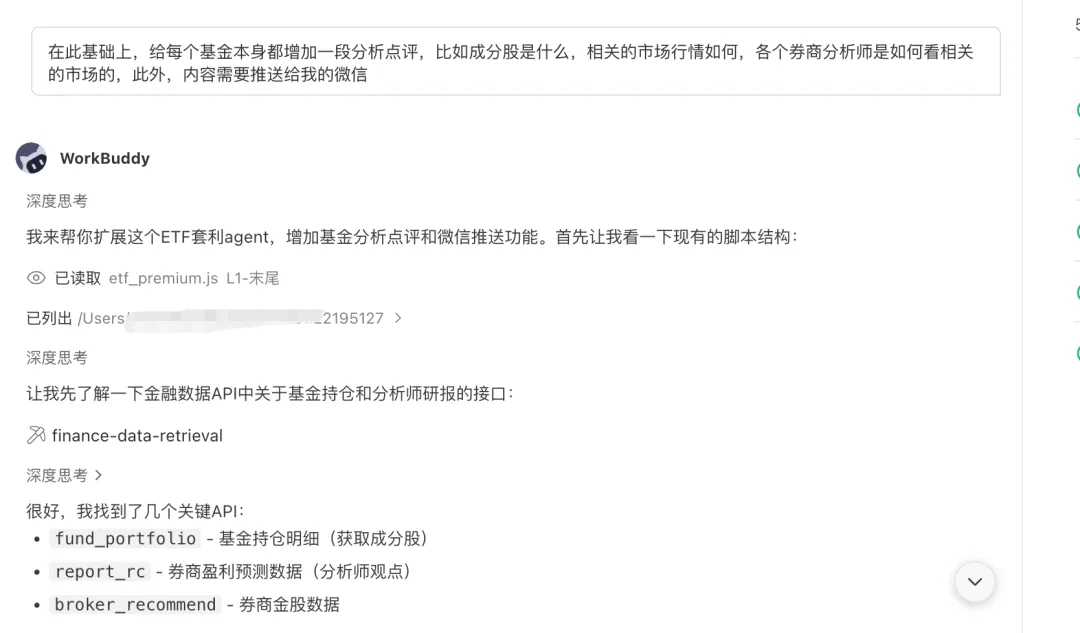 它二话不说,直接读取现有脚本,对接了基金持仓、券商研报的 API,加上了微信推送功能,把定时任务改了时间。