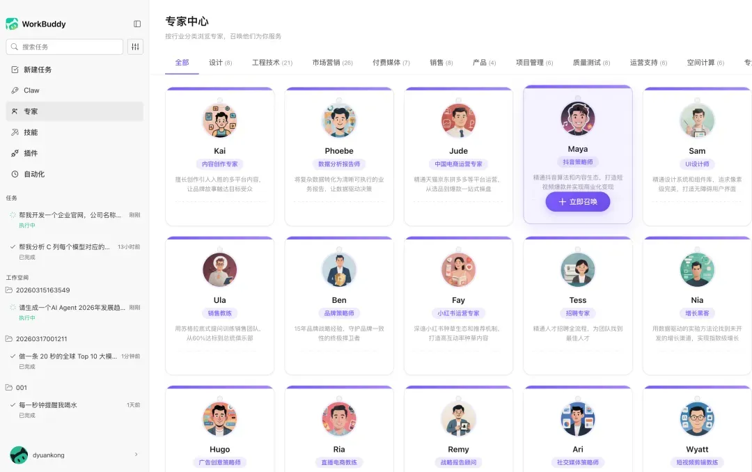 想做内容、搞设计、算数据、做运营,也是一样,从 UI 设计师、增长黑客到招聘专家、销售教练,各行各业的电子同事,借助 WorkBuddy,我们在微信一句话就能召唤。