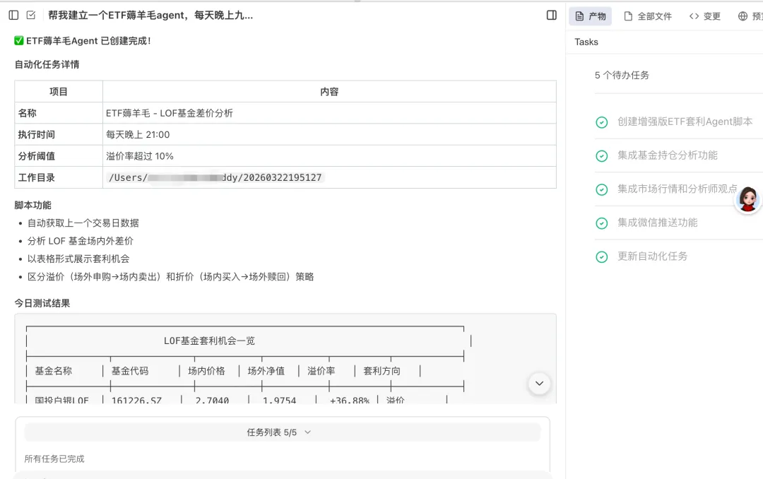 但 WorkBuddy 直接精准识别了这个错误,不仅没顺着我们的错误走,反而直接交付了一套完整的 LOF 基金差价分析 Agent,连细节都拉满了:能自动筛选标的外,区分溢价 / 折价两套套利策略;并且以表格形式输出基金名称、代码、场内价格、场外净值、溢价率、套利方向,连操作建议都给写明白了。