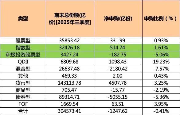 天相投顾数据显示,截至2025年三季度末,各类型基金(含联接基金)期末总份额为30.46万亿份,比上季末减少1247.62亿份,降幅为0.41%。